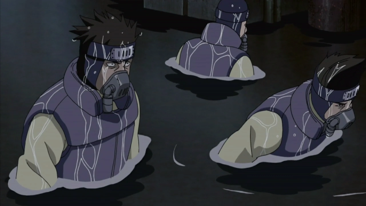 Shinobi of Amegakure are commonly clothed in jumpsuits which can keep most of their covered body from getting too soaked, due to their large lake-like environment. This usually acts as the base of their clothing, sometimes being hidden under the rest of their clothing. Respirators are very common among all shinobi of the village, though some prefer not to wear it all the time. Chūnin and upper ranking individuals are given faded-purple flak jackets. And due to the constant rain which covers the village, and much of the land, individuals are usually with cloaks to keep warm. Some choose to wear long and thick scarves for the same mentioned purpose, which usually hang and reach down most of their bodies.